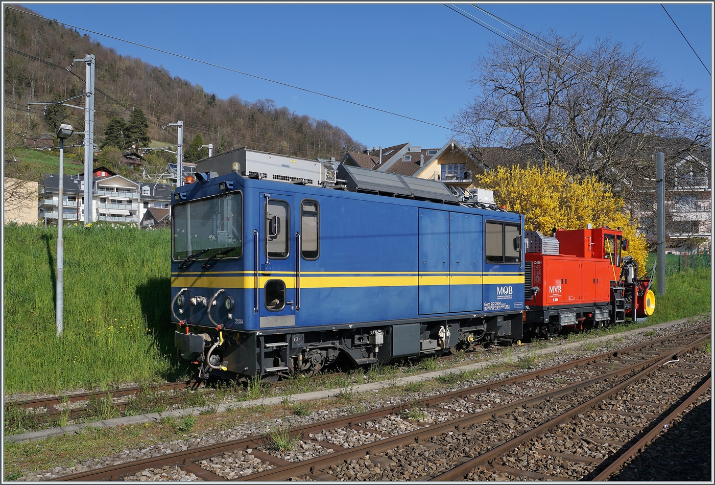 Ungewohnt und so funktioniert es natürlich nicht: die MOB Gem 2/2 2504 steht mit der CEV X464 in Blonay. Später stellte sich heraus, dass die Gem hier nur abgestellt war und nicht die Absicht bestand, das Gefährt als solches so einzusetzen. 4. April 2025