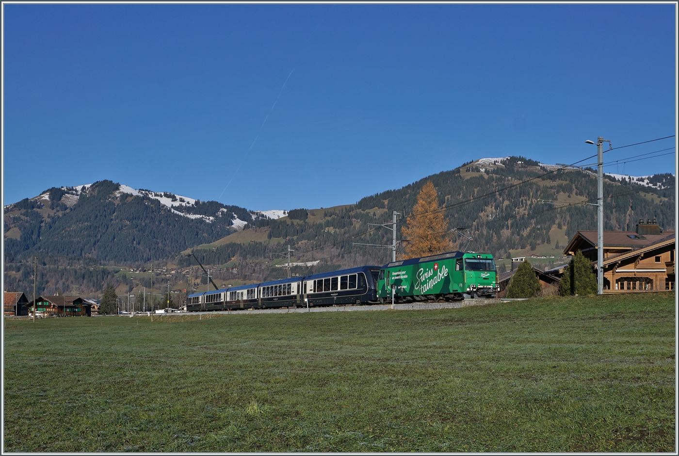 Ein Blick unter der Barriere in Chernex auf den neuen ZAGRO E-MAXI (mit Batterieantrieb). Das Bild zeigt, dass der ZAGRO E-MAXI vier Achsen aufweist, wobei die beiden inneren Achsen wohl gummibereif und ohne Spurkranz dem Antrieb auf Schiene und Strasse dienen.
