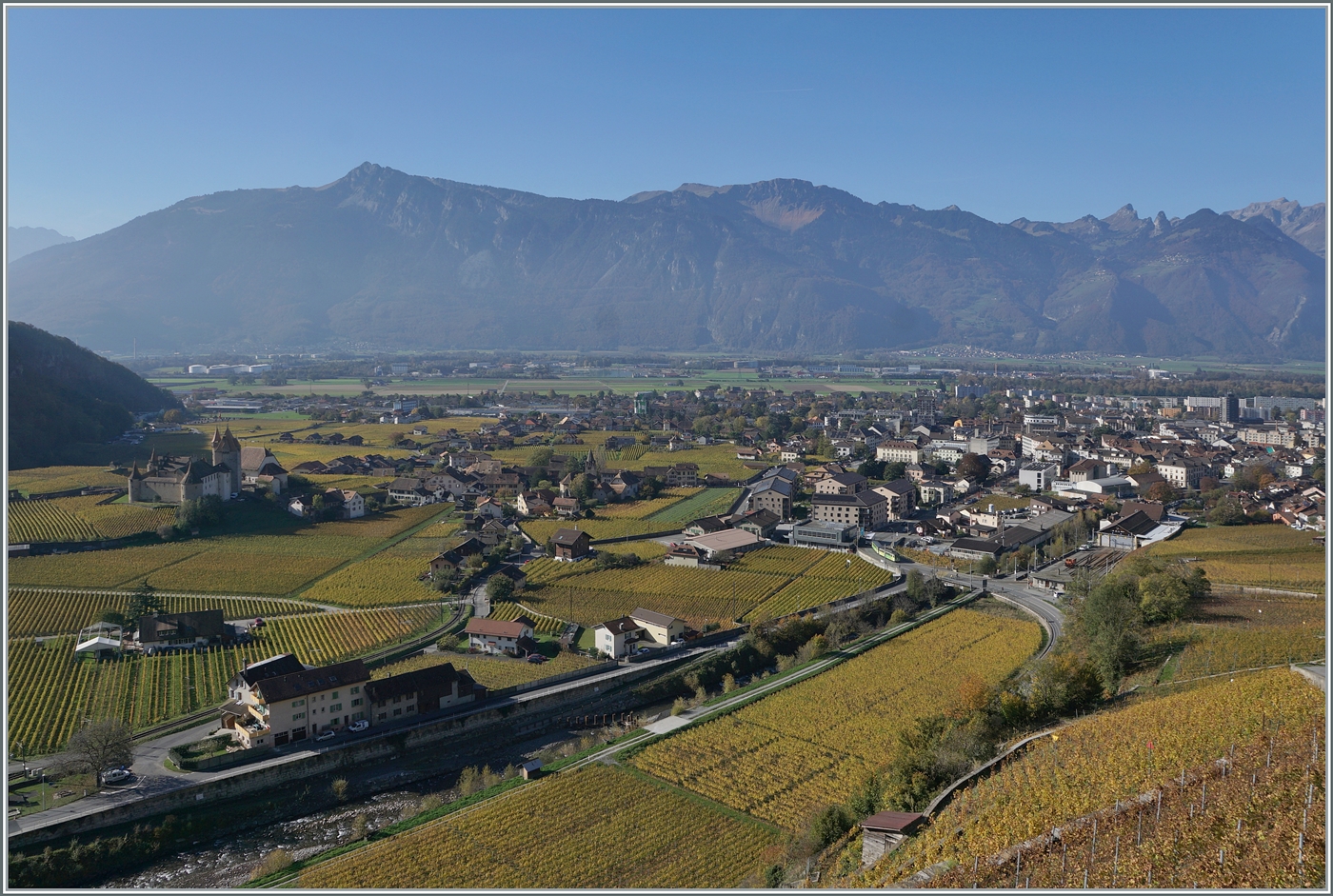 Ein Blick aus dem tpc ASD (Aigle–Sépey–Diablerets) Regionalzug (R 24) Diablerets nach Aigle, der tpc AL (Aigle–Leysin) Regionalzug (R 25) von Leysin nach Aigle fährt am 08 September 2023, fährt oberhalb von Aigle durch die Weinberge. Der dreiteilige AL-Zug bestand aus dem 2. Klasse elektrischen Personentriebwagen mit Gepäckabteil für den gemischten Zahnrad- und Adhäsionsbetrieb AL BDeh 4/4 313 „La Berneuse“, Steuerwagen AL Bt 362 und dem Steuerwagen AL Bt 363.