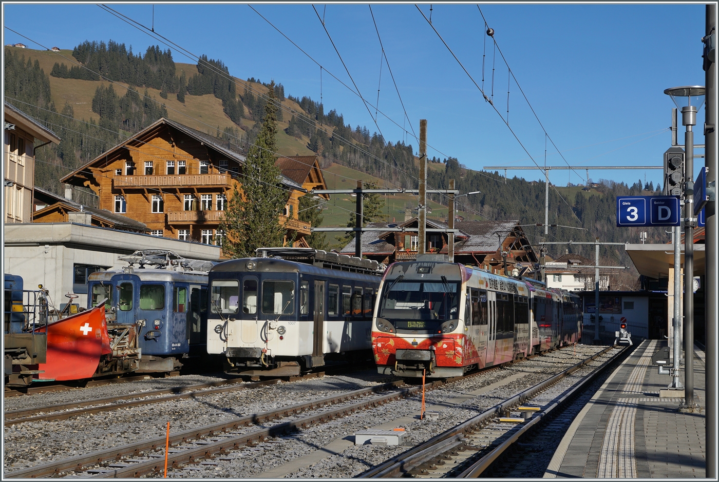 Oberhalb von Aigle windet sich das Trasse der ASD in weiten Schleifen durch die Rebberge; auf dem Weg nach Aigle ist beim Schloss von Aigle der ASD R 71 435 mit dem führenden Bt 434 und dem schiebenden BDe 4/4 402 unterwegs.