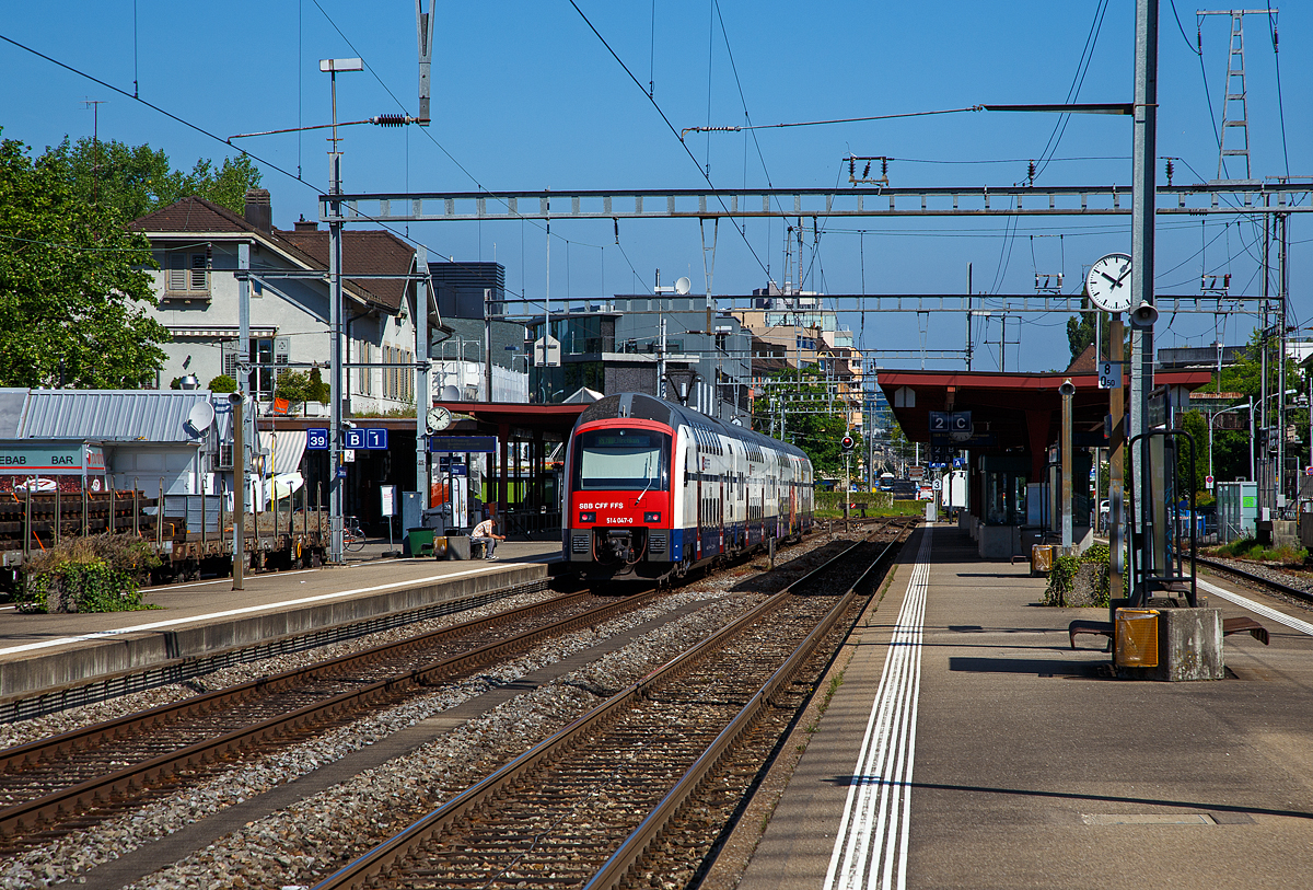 Die SBB Re 450 000-5 "Seebach", ex Re 4/4 450 000, schiebt einen Doppelstock-Pendelzug (der erste Generation) Zürcher S-Bahn als S7 nach Winterthur in den Bahnhof Zürich-Tiefenbrunnen.