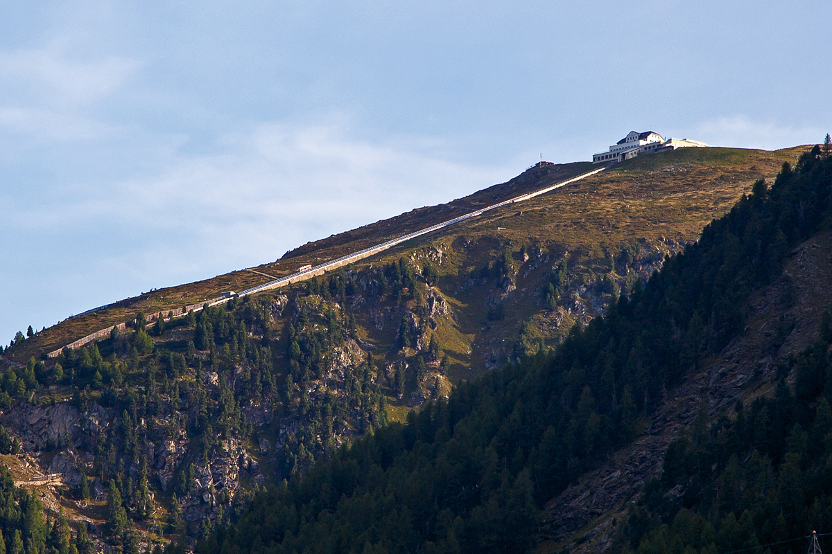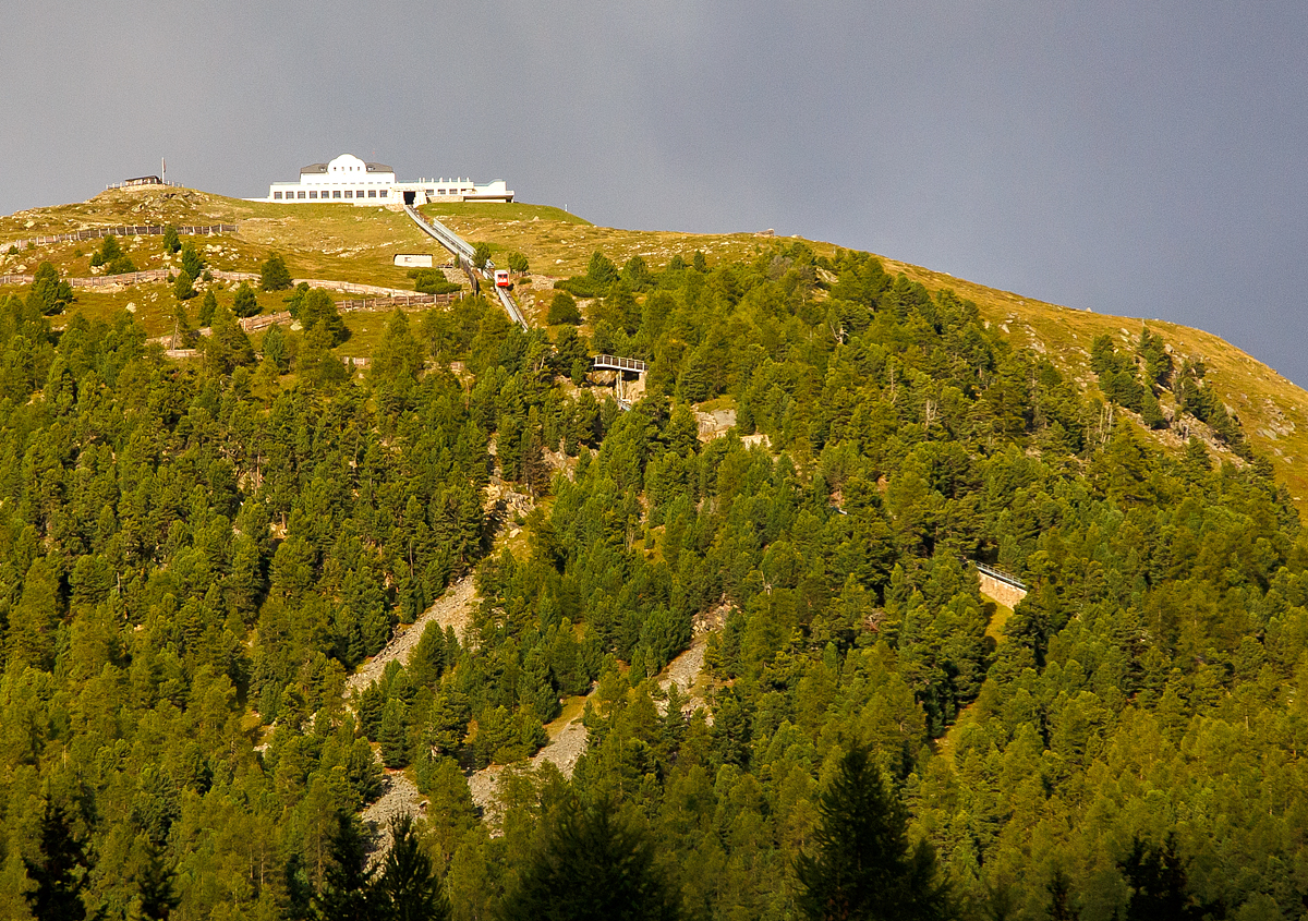 Blick vom Vorplatz des RhB Bahnhof St. Moritz am 20 Februar 2017 auf die Standseilbahn Muottas-Muragl-Bahn (MMB). Die Standseilbahn führt von Punt Muragl (1.739 m ü. M.) zwischen Samedan und Pontresina, auf den Muottas Muragl (2.448 m ü. M.). Die Bahn hat eine Streckenlänge von 2.199 m und überwindet eine Höhendifferenz von 709 m. Sie ist die älteste Bergbahn im Engadin und feierte 2007 ihr 100-jähriges Bestehen.