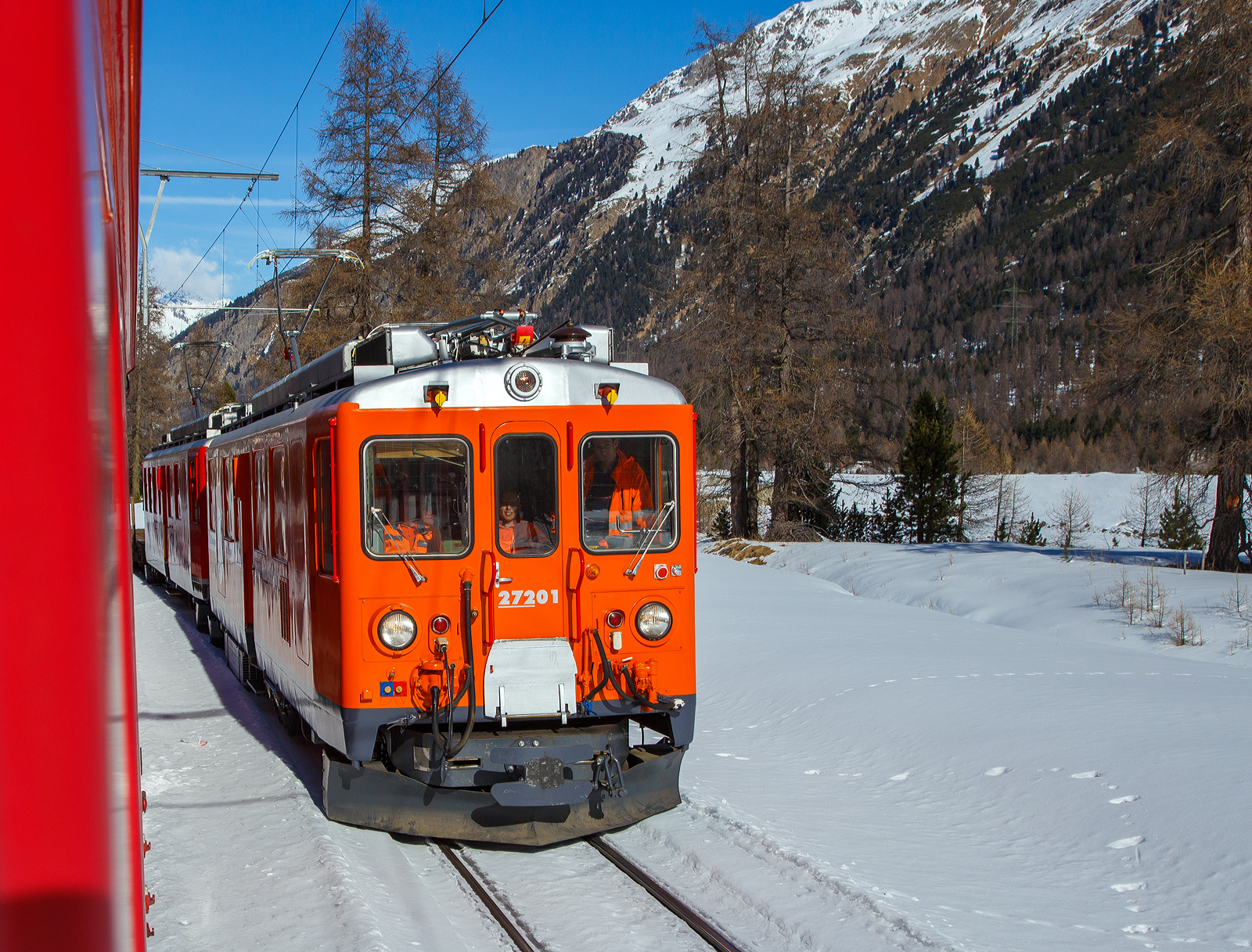 "Der RhB Triebwagen ABe 4/4 II 46 wird am 22.03.2023 in Pontresina an einen Bauzug gekuppelt.