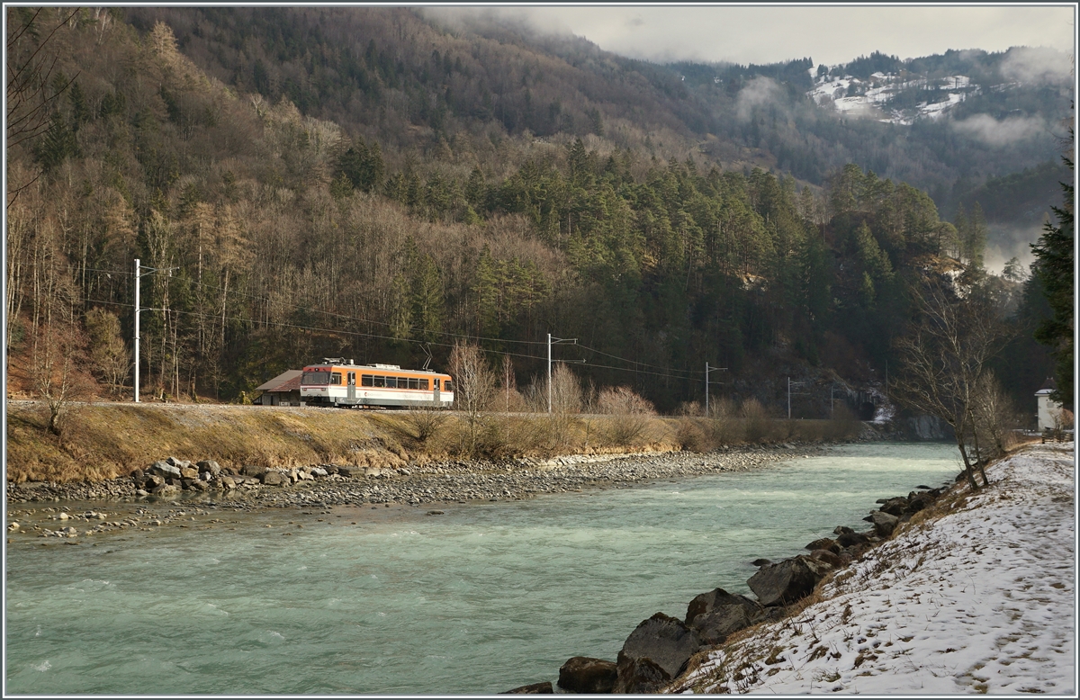 Der ex CEV Be 2/6 7004 "Montreux, nun als Zentralbahn Be 125 013 unterwegs, verlässt bei garstigem Wetter Innterkirchen mit dem Ziel Meiringen.