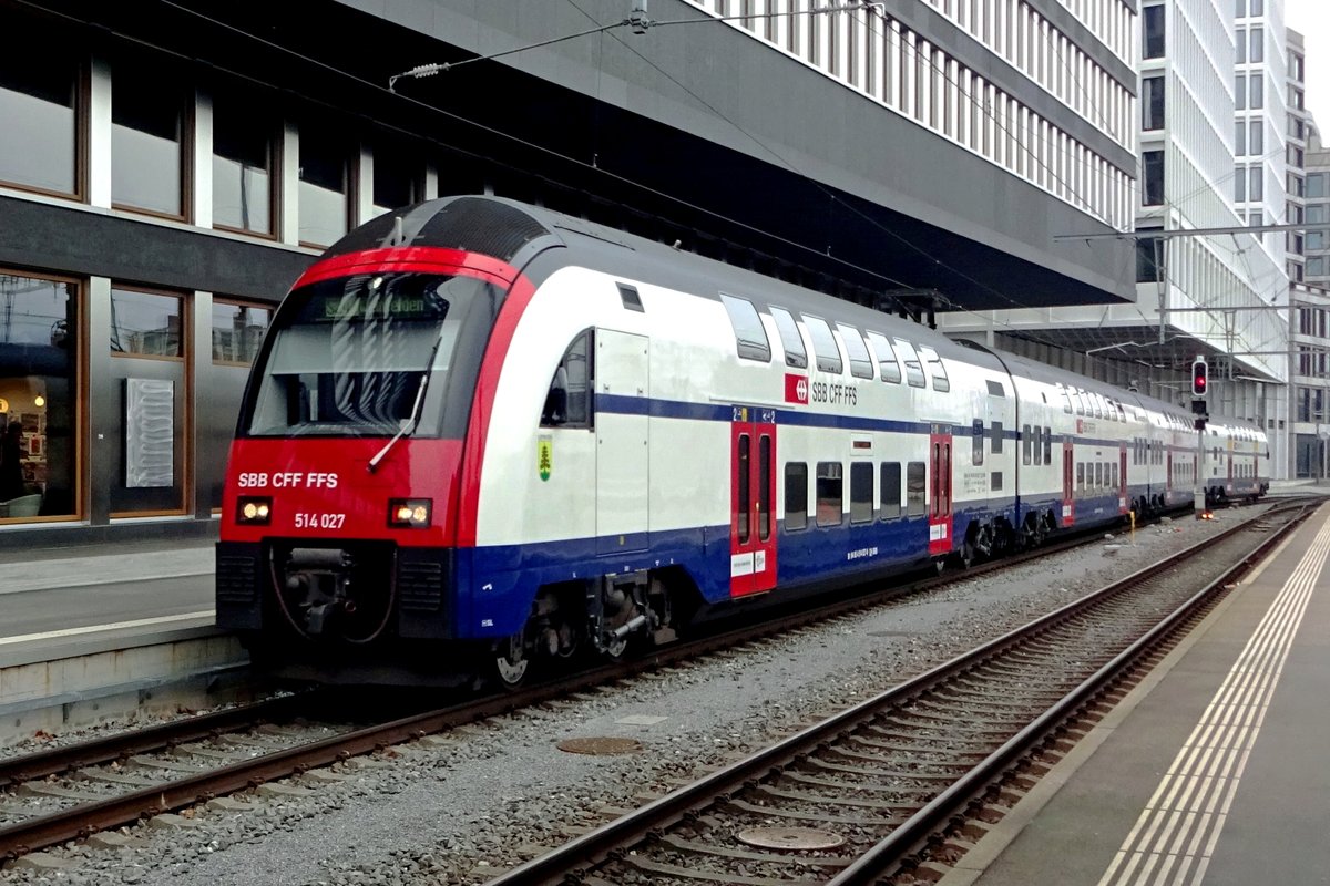 Der SBB RABe 514 047-0 (ein DTZ bzw. Siemens Desiro Double Deck) fährt am 07.06.2015, als S 16 nach Effretikon, in den Bahnhof Zürich-Tiefenbrunnen ein. Recht steht der 110t - KIROW Gleisbauschienenkran KRC 1010 der Vanomag AG, Kran XI, Schweres Nebenfahrzeug Nr. 99 85 9219 031-3 CH-VMG VTmaass. Am 23. Februar 2003 entschied der SBB Verwaltungsrat die ersten 35 Züge für die S-Bahn Zürich bei Siemens Transportation Systems zu bestellen. Diese Entscheidung kam relativ überraschend, da Siemens zuvor noch keine Doppelstockzüge hergestellt hatte. Die DTZ bilden die zweite Fahrzeuggeneration der Zürcher S-Bahn und ergänzen seit 2006 die erste Generation in Form der Doppelstockpendelzug (DPZ). Gegenüber diesen verfügen die DTZ über Niederflureinstieg, Fahrzeugklimatisierung und Vakuumtoiletten. Der vierteilige Triebzug bestehend aus zwei Triebköpfen und zwei Mittelwagen und wird in den beiden Triebköpfen von Asynchrommotoren, die jeweils ein Triebdrehgestell versorgen, angetrieben. Damit sind insgesamt 8 Achsen mit jeweils 400kW angetrieben. Von beiden Triebköpfen muss jeweils ein Stromabnehmer an die Fahrleitung angelegt werden, da aus Platzgründen keine 15kV Dachleitung vorhanden ist. Die zweiflügeligen Außentüren wurden behindertengerecht mit Schiebetritten ausgerüstet. Technische Daten Gebaute Anzahl: 61 vierteilige Triebzüge Baujahre: 2005-2008 (1.+2.Serie) Spurweite: 1.435mm (Normalspur) Achsformel: Bo-Bo+2`2`+2`2`Bo-Bo Länge über Kupplung: 100 m Höhe: 4.600mm Breite: 2.780mm Leergewicht: 225t Achsabstand im Drehgestell: 2.500mm Raddurchmesser: 920mm Höchstgeschwindigkeit: 140 km/h Stundenleistung: 3.200 kW Anfahrzugkraft: 240kN Beschleunigung: 1,1m/s2 Stromsystem: 15kV 16,7 Hz Sitzplätze: 1.Klasse 74 / 2.Klasse 304 Stehplätze: ca. 600 Einstieghöhe: 600mm über SOK