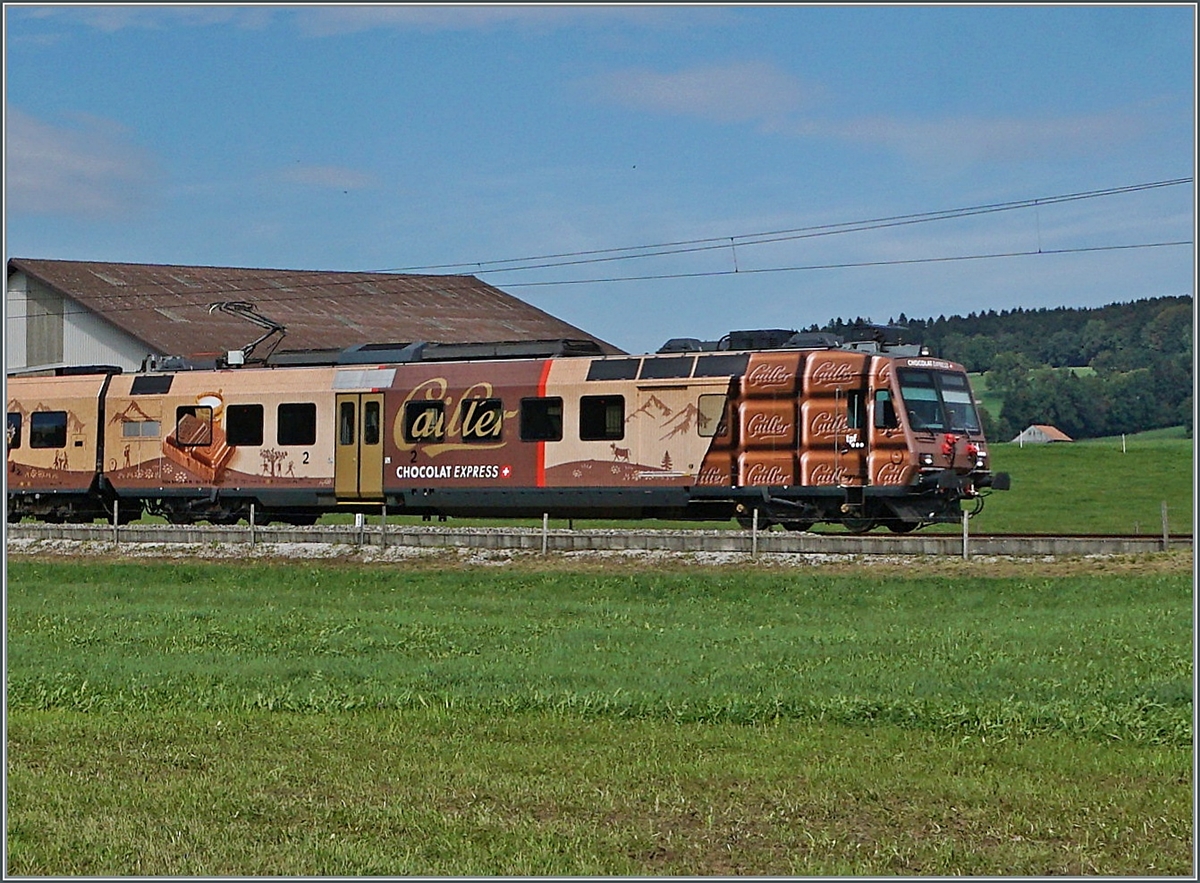 Die beiden TPF RBDe 560 245 und 235 Domino Züge in der "Chocolat Express" Werbung sind als RE 3825 von Broc-Farbique nach Bern unterwegs. Das Bild entstand zwischen Vaulruz und Sâles vor dem Hintergrund der Fribouger Alpen.