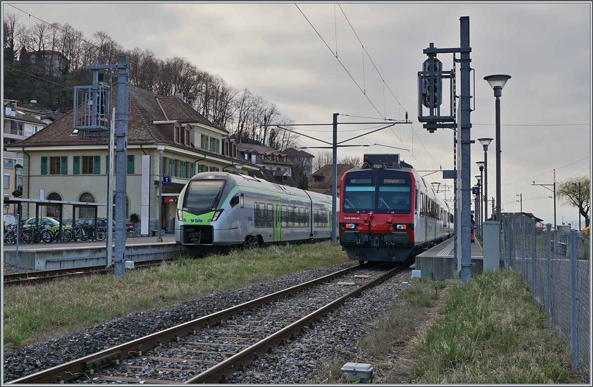 Der BLS RABe 528 109 ist als R 91 6125 von St-Gingolph nach Brig in Bouveret eingetroffen und wartet auf den Gegenzug. 4. März 2024