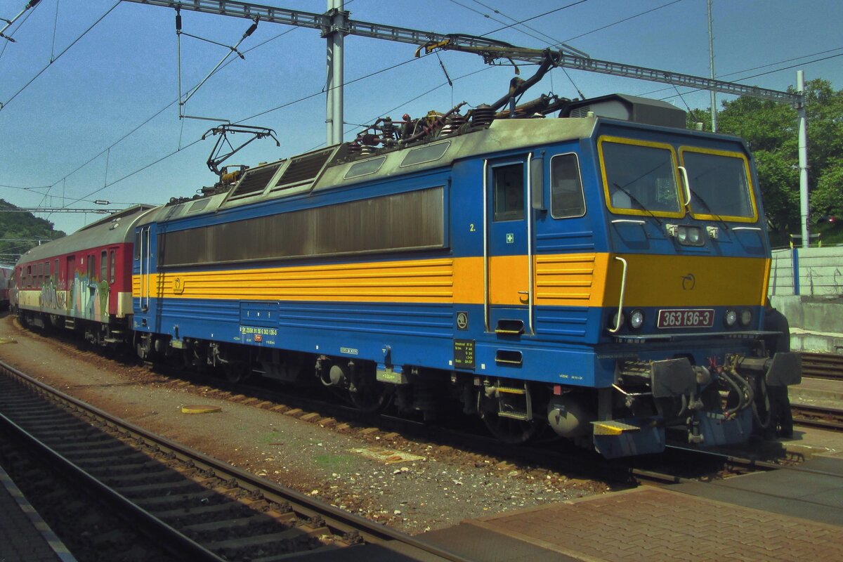 Werbe-Pershing 362 002 steht am 29 Mai 2015 in Bratislava hl.st. mit ein Rychlyk nach Zilina.