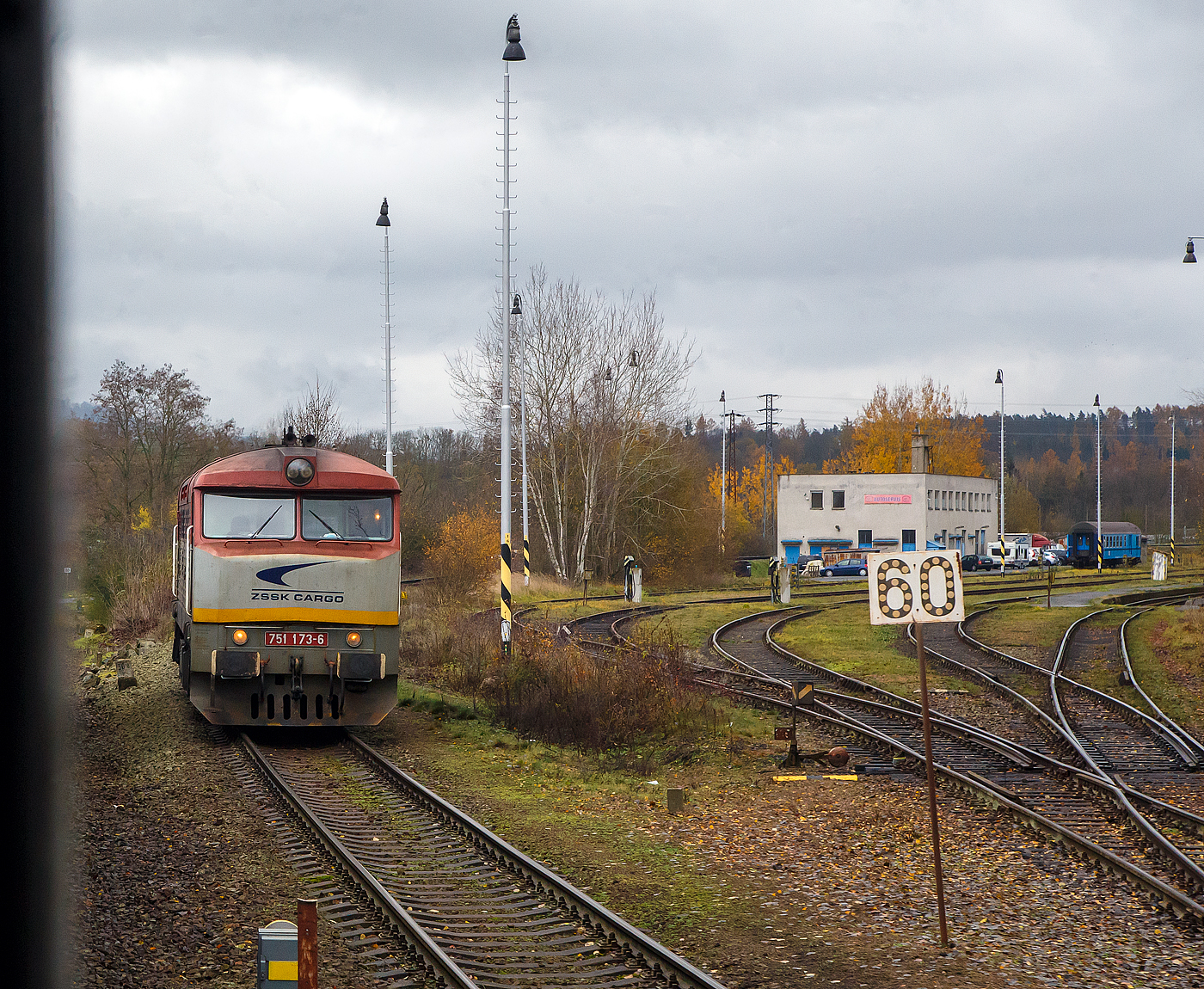 Wir erreichen am 24.11.2022 mit dem alex EC 360 / Ex 6 (Praha – München) nun den Bahnhof Domažlice (Taus), wo gerade rechts die ZSSK Cargo 751 173-6 rangiert. Die Baureihe 751, ex ČSD-Baureihe T 478.1, ist eine dieselelektrische Universallokomotive der ehemaligen Tschechoslowakischen Staatsbahnen (ČSD). Die Lokomotiven prägten ab den 1960er Jahren den Streckendienst auf nichtelektrifizierten Strecken der ČSD und galten auf Grund ihrer Zuverlässigkeit als eine der erfolgreichsten Diesellokomotiven in der ehemaligen Tschechoslowakei. Unter Eisenbahnfreunden erfreuten sich die Maschinen, die auf Grund ihres markanten Äußeren den Spitznamen Bardotka (abgeleitet von Brigitte Bardot) oder Zamračená (Finstergesicht) erhielten. Zwischen 1966 und 1977 wurden von ČKD Praha 230 Loks als T 478.1 und 82 Loks als T 478.2 gebaut. Die Grundlage für die Lokomotive bildete der Anfang der 1960er Jahre erstellte komplexe Aufgabenplan zur Motorisierung der Eisenbahn. Zu der Zeit waren bereits konstruktiv gut gelungene Motorlokomotiven bei den ČSD im Einsatz, die jedoch entweder zu leistungsschwach (ČSD-Baureihe T 435.0) oder nur eingeschränkt im Streckendienst verwendet werden konnten (ČSD-Baureihe T 679.0). Speziell für die kurvenreichen Strecken in Böhmen wurden vierachsige Lokomotiven mit höchstens 18 t Achslast benötigt. Die Entwicklung der ЧМЭ3 für die UdSSR brachte als Antriebsmotor den neuen 1.350 PS bzw. 1.500 PS leistenden Dieselmotor K 6 S 310 DR mit Aufladung hervor, der für den Einsatzzweck geeignet war. Da zur selben Zeit einige Erprobungsmuster mit Strömungsgetriebe entstanden, die sich nicht bewährten, wurde bei der neuen Streckenlokomotive auf dieselelektrische gewählt. Technische Beschreibung: Die Baureihe 851 ex ČSD-Baureihe T 478.1 sind vierachsige Lokomotiven mit dieselelektrischer Kraftübertragung und Einzelachsantrieb aller Achsen, die Nennleistung des Dieselmotors beträgt 1.104 kW (1.500 PS). Damit ist die Lokomotive für die Beförderung von Personen- und Güterzügen bis 100 km/h vorgesehen. Der Lokkasten ist eine Fachwerkkonstruktion. Die Führerstände bestehen aus Glasfaserlaminat mit einer Stahlgerippe Versteifung. Das Dach des Lokkastens besteht aus Stahlblech, es ist zweiteilig, abnehmbar und mit speziellen Wartungsklappen versehen. Der geschweißte Hauptrahmen wurde durch Stahlprofile verstärkt. Im unteren Teil des Rahmens befinden sich Drehzapfen für die Verbindung mit den Drehgestellen. Das Fahrwerk besteht aus zwei zweiachsigen Drehgestellen mit Rahmen in Form von einem H. Im Querträger ist eine Öffnung für den Drehzapfen vorhanden. Die Treibradsätze sind seitlich über abgefederten, mit Reibungsdämpfern versehenen Schwenkarm eingehängt. Der Fahrmotor vom Typ TE 005 ist über einen Tatzlager-Antrieb mit der Antriebsachse und dem Drehgestell verbunden. Zwischen Motor und Antriebsrad besteht das Übersetzungsverhältnis 16:77. Im oberen Teil des Drehgestellrahmens sind die Bremszylinder mit Gestänge und Luftleitungen untergebracht. Alle Räder werden beidseitig abgebremst. Seitlich am Rahmen der Drehgestelle sind Stützen mit Kugelzapfen für die Aufhängung des Lokomotivkastens angebracht. Die Maschinenraumaufteilung entspricht den konstruktiven Gewohnheiten von ČKD. Hinter dem Führerstand I ist der elektrische Hauptverteiler angeordnet. Dahinter ist der Heizkessel platziert, an ihm vorbei führen Gänge zum Führerstand II und zu der anderen Maschinenraumseite. Beide Führerstände sind gleich gestaltet, rechts ist der Führertisch mit Fahrschalter, Führerbremsventil sowie Schalt- und Kontrollelementen platziert. Der gekoppelte Maschinensatz Kompressor-Hauptgenerator - Dieselmotor - Getriebe für die Hilfsantriebe liegt in der Längsachse der Lokomotive. Die Seitenteile des Daches enthalten Luftansaugsiebe für Motor, Kompressor, Eigenbelüftung des Generators sowie die Kühlung der Fahrmotoren. Unter dem Dach, mittig im Maschinenraum sind die Auspuffrohre des Dieselmotors angeordnet. Im hinteren Teil des Maschinenraumes sind beidseitig Kühlschächte mit in oberen Bereichen hydrostatisch angetriebenen Lüfterschaufelrädern angeordnet. Zwischen den Kühlerblöcken befindet sich die Tür zu dem Führerstand II. Als Antriebselement dient der stehend angeordnete langsam laufender (775 U/min) Sechszylinder-Viertaktdieselmotor vom Typ K 6 S 310 DR, der mit Mitteldruckaufladung betrieben wird. Der Zylinderdurchmesser ist 310 mm, der Kolbenhub 360 mm, das ergibt einen Hubraum von 163 l. Bei 775/min beträgt seine Nennleistung 1.104 kW (1.500 PS). Das zweiteilige Motorgehäuse besteht aus Stahlguss und Stahlblechen. Der untere Teil dient als Ölwanne, der obere als Kühlblock und Halterung für die Zylinderlaufbuchsen. Im oberen Seitenteil ist die Nockenwelle für die Stoßstangen angeordnet. Sechs einzelne Zylinderköpfe schließen den Motorblock nach oben ab. Der Regler für die Motorsteuerung ist über eine Zahnstange gelenkig mit den einzelnen, an der Seite des Motorgehäuses platzierten Einspritzpumpen verbunden. Auf der anderen Gehäuseseite des Motors sind der Ölkühler und das Auspuffsammelrohr angeordnet, letzteres führt zu dem Turbolader PDH 50 ZV, der sich gemeinsam mit dem Ladeluft-Zwischenkühler am hinteren Motorende befindet. Die Kurbelwelle ist aus einem Teil geschmiedet, sie hat sechs jeweils um 120° versetzte Kurbelkröpfungen und ist in Gleitlagern gelagert. Diese haben Stahlpfannen, die mit Bleibronze mit zu legiertem Silber und Zinn ausgegossen sind. Die vom Dieselmotor abgegebene Primärleistung wird an den Hauptgenerator D 802 C abgegeben, der 980 kW Strom für die elektrischen Fahrmotoren liefert. Der Generator ist eine zehnpolige, eigenbelüftete und fremderregte Gleichstrommaschine. Das freie Wellenende des Generators trägt eine Riemenscheibe, von dieser wird die Erregermaschine angetrieben. Diese liefert Strom für die Fremderregung des Hauptgenerators und das Laden der Akkumulatoren. Die vom Generator ge
