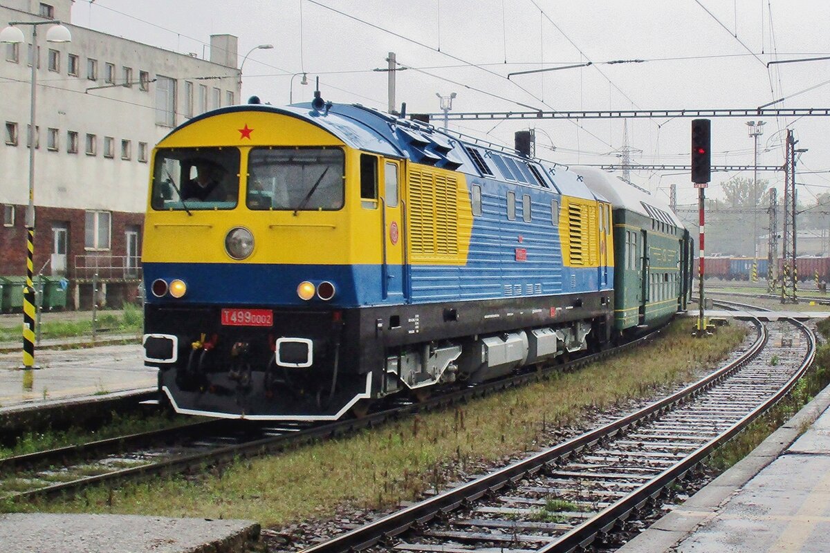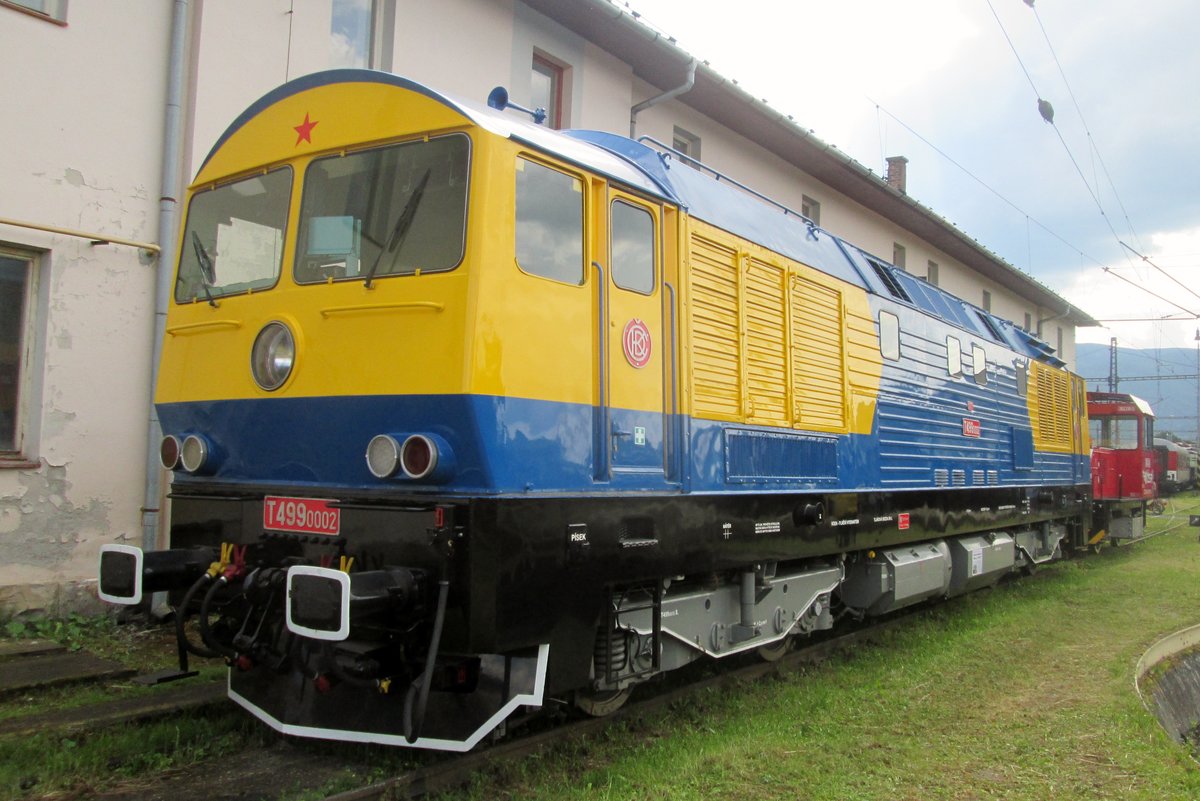 Kyklop Prototyp T499 0002 steht am 13 Mai 2012 ins Eisenbahnmuseum von Luzna u Rakovnika. In 1975 bestellten die CSD bei CKD in Prag zwei Prototypen für eine 140 km/h schnelle Streckendiesellokomotive. Schwierigheiten mit der Dieselmotor des Loks und die verschobene Prioritäten auf die Elektrifizierung machten die beide Prototypen veraltet und eine Serienbau unterblieb. Die T479 0001 wurde in ein Feuer zerstört, aber Eisenbahnliebhaber haben die 0002 betriebsfähig restauriert. Sie ist heute Eigentum des Eisenbahnmuseums in Luzna und wird regelmässig für Sonderzüge einbgesetzt.