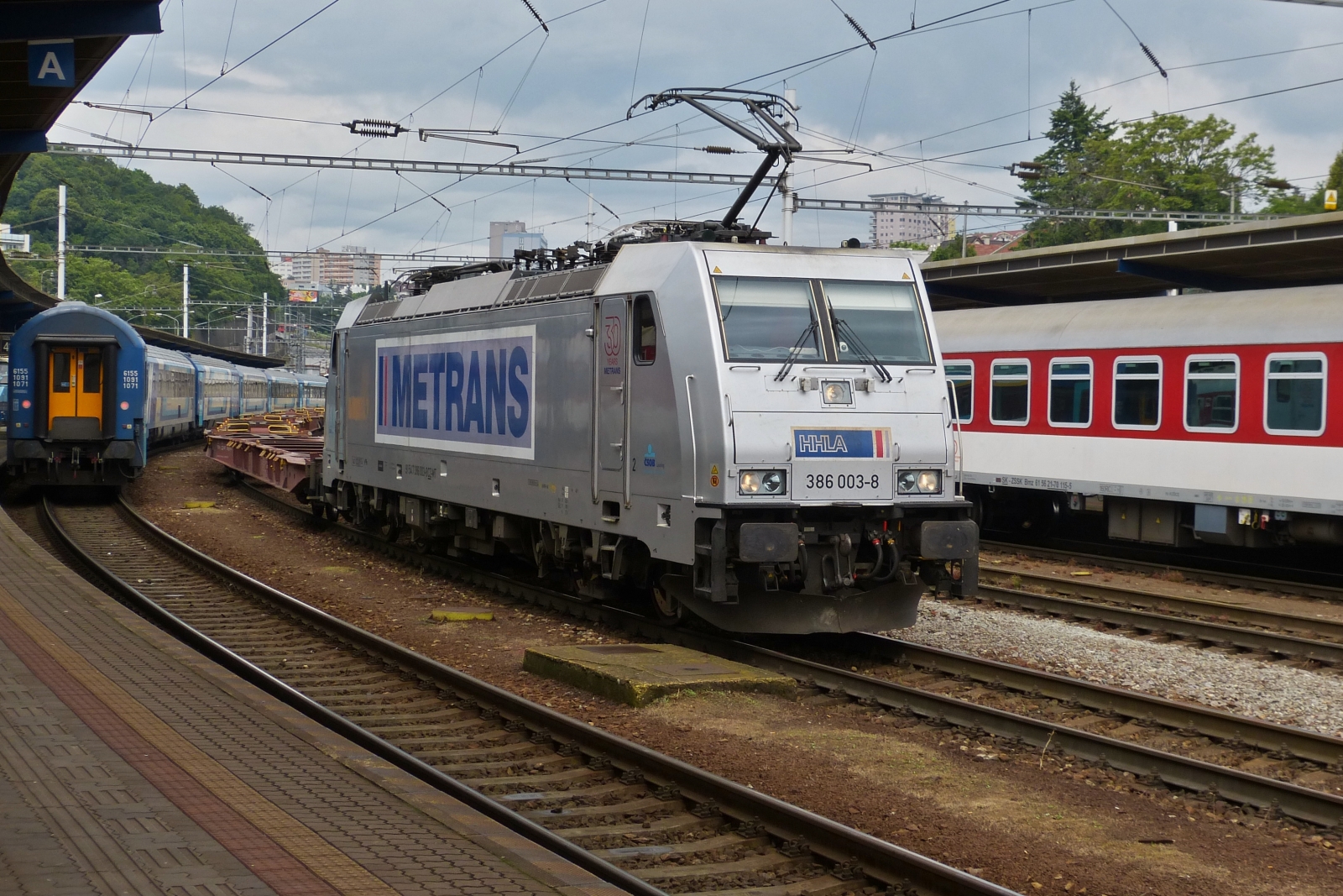 Vom Bahnsteig aus wurde am 27 September 2025 der Metrans Doppelpack mit 386 033 führend in Benesov u Prahy fotografiert.