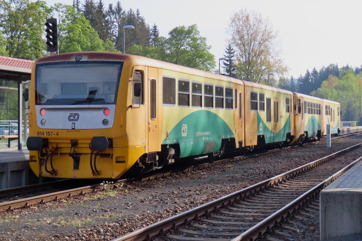 CD 814 090 steht am 26 September 2025 in Praha-Masarykova. Wer die Atmosphär das alten Bahnhofs fotografieren will, soll rasch sein, weil der Bahnhof komplett umgebaut wird, wie Mann in Hintergrund sehen kann.